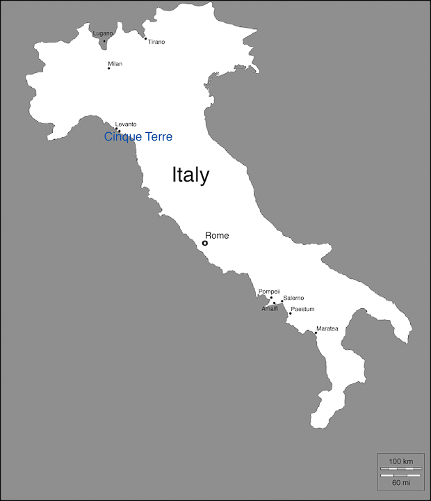 Day 7: Exploring Cinque Terre, a series of five villages on the Mediterranean coast joined by a hiking trail. We took the train south to the farthest village, Riomaggiore, and wended our way back through the villages to Levanto.